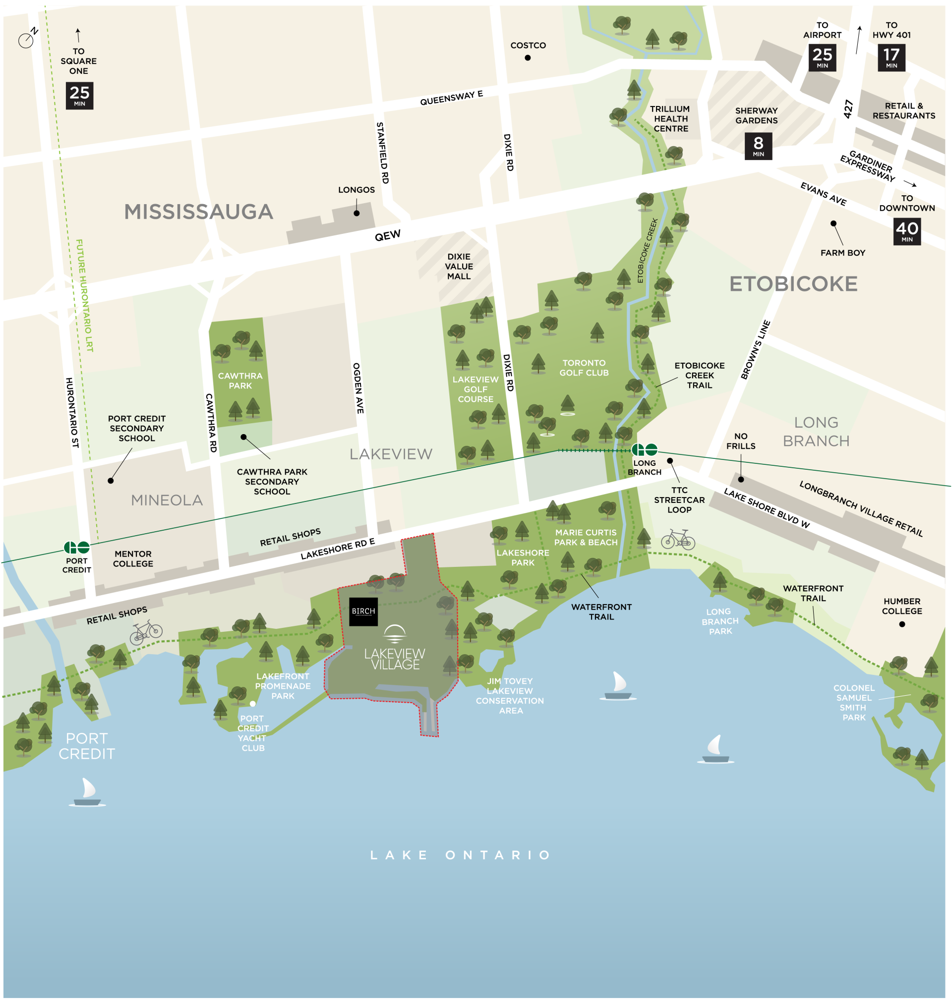 Birch is situated within the Lakeview Village community, occupying a prime spot where Mississauga's waterfront meets Toronto's urban edge. Lakeview Village spans 177 acres of destination waterfront lands, designed to create a vibrant and sustainable neighbourhood. The development enjoys direct access to the shores of Lake Ontario, providing beautiful views and ample recreational opportunities.
