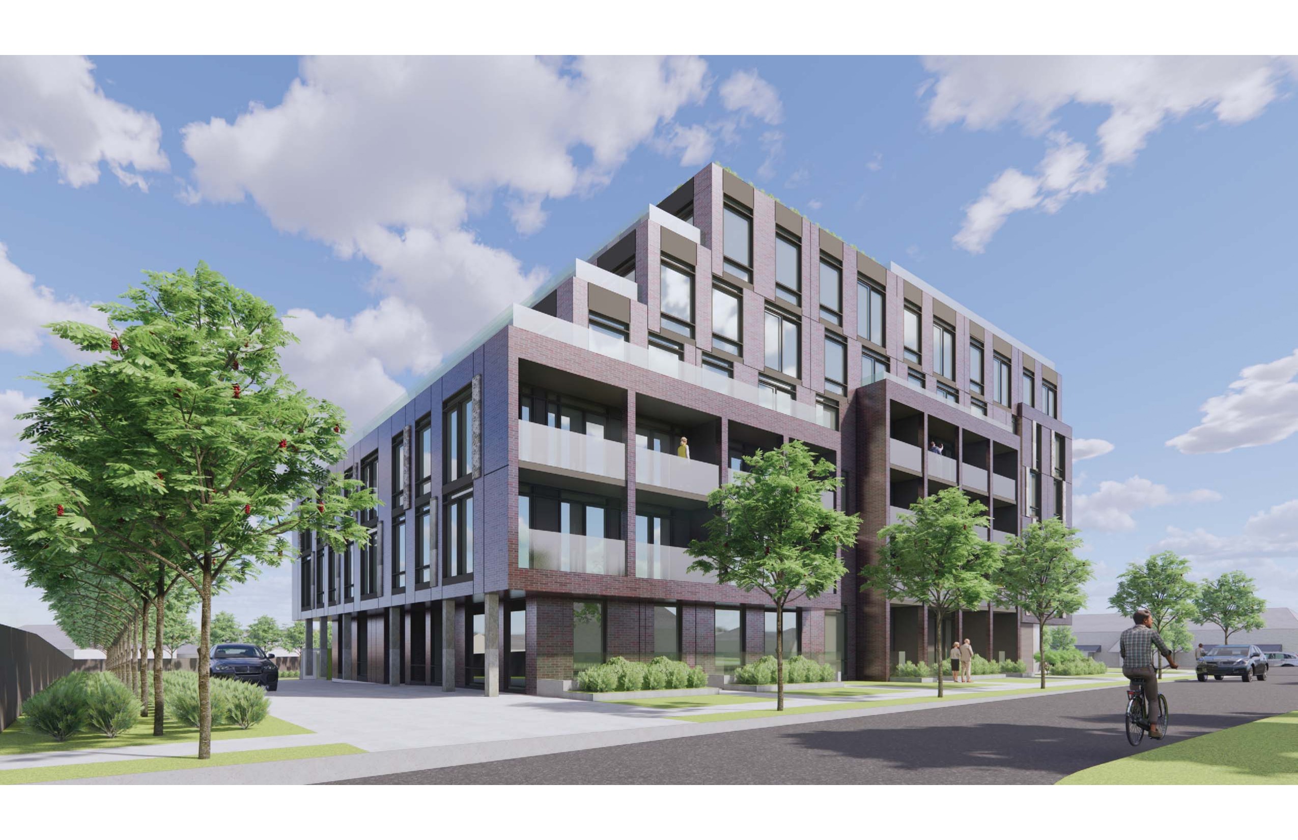 Upscale amenities including fitness facility, shared workspace, and green roof