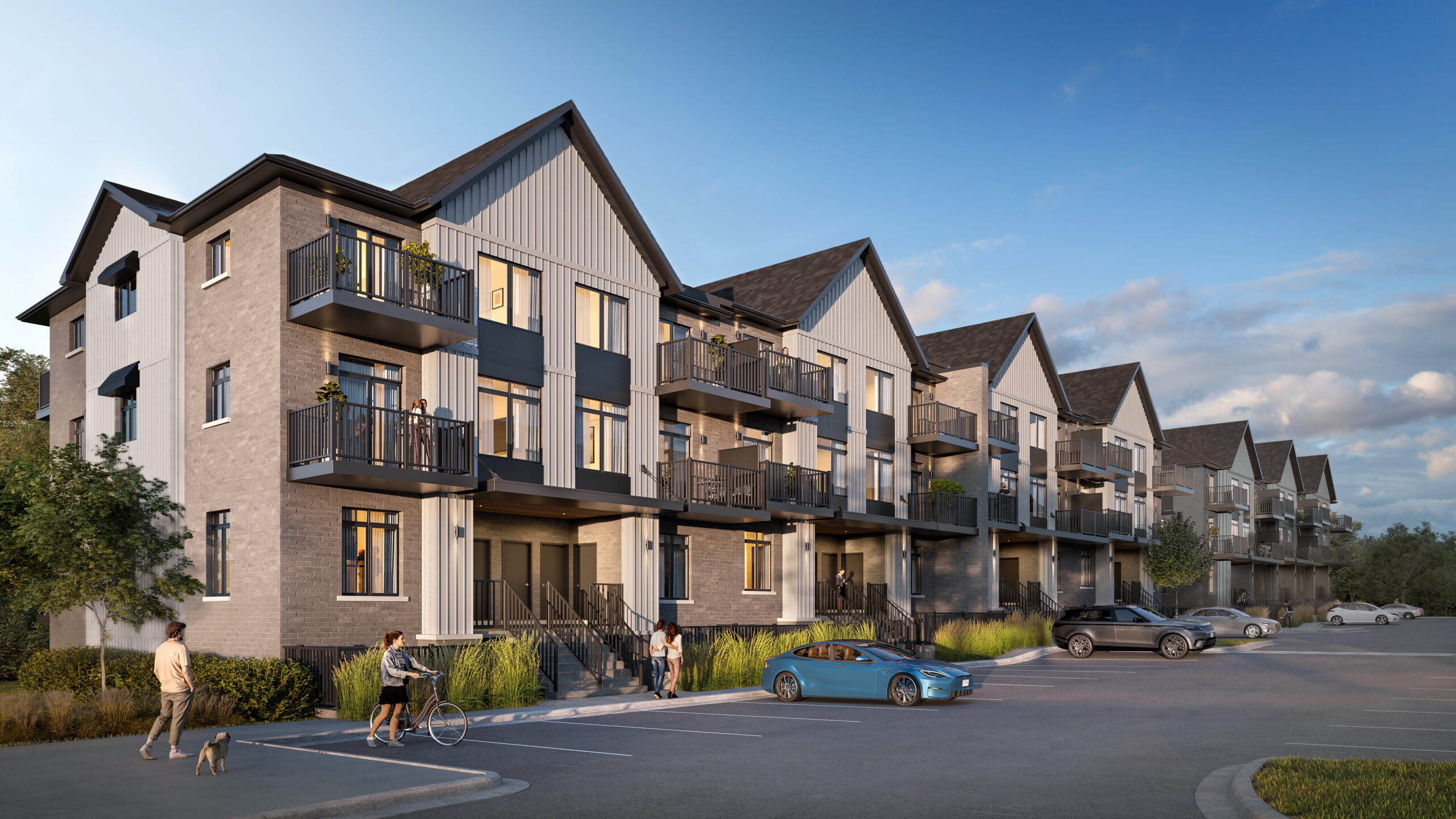 Northside is a low-rise stacked townhouse community located at 824 Woolwich Street in North Guelph. The development features one-storey flats and two-storey stacked townhomes arranged around a centrally planned outdoor space. The community layout emphasizes functional design, shared green space, and proximity to everyday amenities.