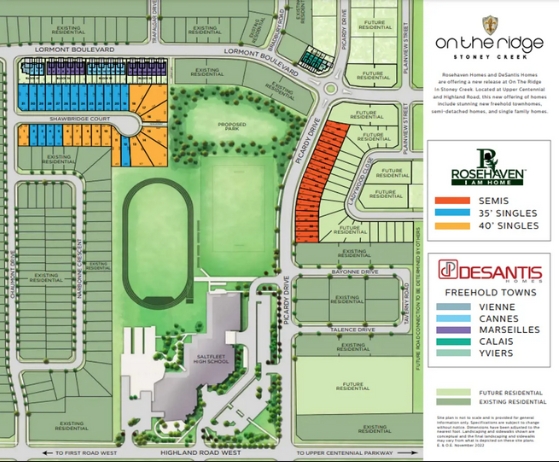 On the Ridge - Phase III is a new towns development by DeSantis Homes. Prices estimated to be starting from $894,900 to $1,279,900 and will feature 33 units at 2 storeys. On the Ridge - Phase III is nearby Heritage Green Park and the Stoney Creek GO, the project is estimated to be completed in 2026 and will be located on 28 Mud Street West at the Stoney Creek neighbourhood in Hamilton.