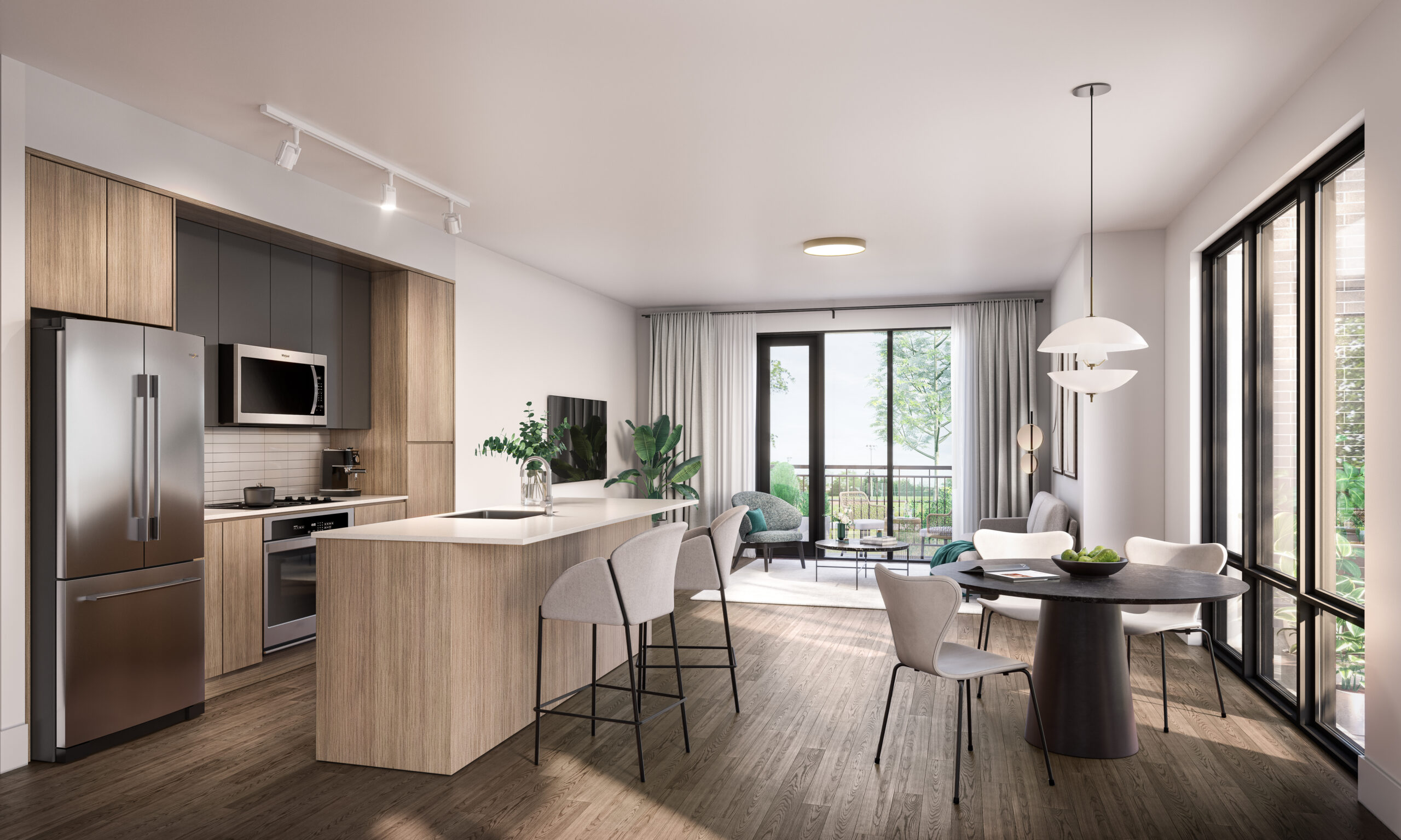 Park Haus presents a meticulously crafted living experience with carefully curated features and finishes designed by experts to deliver high-quality, refined living. Prioritizing security and safety, the residence includes surveillance cameras in select areas, an electronic access control system, and fire alarm and emergency sprinkler systems. Mechanical, electrical, and technological systems offer individual heating/cooling, remote metering, and prewiring for communication outlets. Bathrooms boast quartz countertops, chrome fixtures, porcelain tiles, and custom vanities. The contemporary suites showcase premium flooring, modern entry doors, mirrored sliding closet doors, and 9' ceilings. The kitchen is a gourmet haven with quartz countertops, custom cabinets, stainless steel appliances, and under-cabinet lighting. The exterior of the building blends brick, stone, and EIFS, creating a modern facade. Common areas include a multipurpose room, underground parking with remote access, visitor parking, private bicycle storage, and waste management facilities. Units with walkout patios and rooftop terraces provide private outdoor spaces, complemented by a spacious rooftop for residents to enjoy the seasons. The kitchen, designed as the heart of the home, features wide windows, sleek countertops, finely crafted cabinetry, and stylish lighting for chic contemporary living. Luxurious ensuites offer a spa-like experience with deep soaker tubs, stunning countertops, and valance lighting. Master bedrooms provide warm and cosy retreats, accommodating standard-sized beds and dressers. Park Haus sets a new standard for upscale living with its thoughtful details and luxurious amenities.