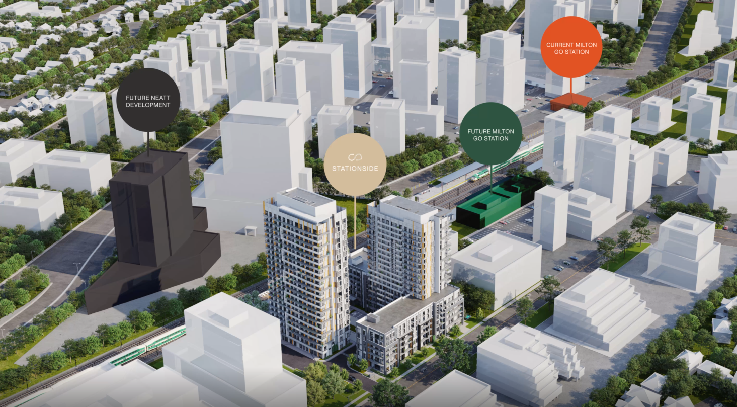 Stationside is a new high-rise development by Neatt Communities. Prices estimated to be starting from $500,000 and will feature 613 units at 23 & 19-storey buildings. Stationside is nearby Lions Park Diamond 2 and the Milton GO Station, the project is estimated to be completed in 2027 and will be located on 145 Nipissing Road at the Dorset Park neighbourhood in Milton.
