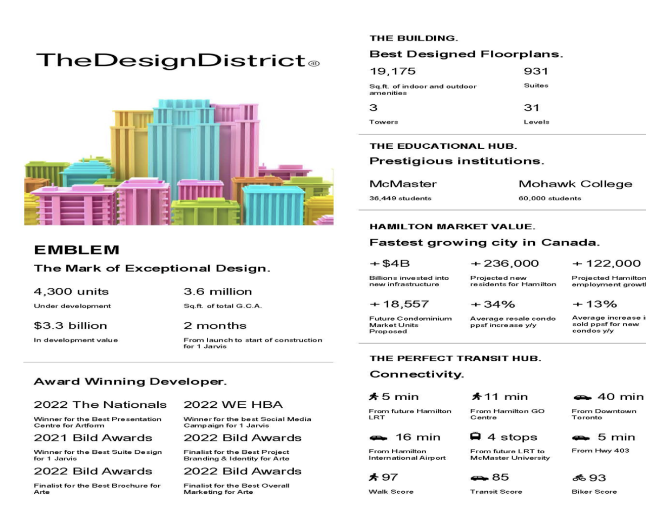 With its central location in downtown Hamilton, The Design District offers residents the opportunity to immerse themselves in the city's vibrant atmosphere, while enjoying the comfort and luxury of a modern condominium community. Experience the best of urban living in this iconic landmark that will forever change the landscape of Hamilton and leave a lasting impression on the city's skyline.