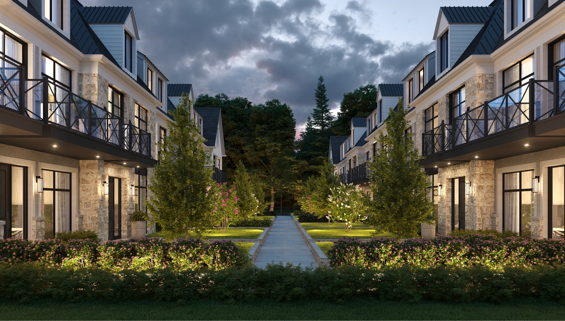 Distinctive Exteriors: The Lake House’s exterior architecture exudes elegance and refinement, with hand-tumbled stone, artisan white brick, expansive windows, and beautiful metal awnings. Spacious balconies and terraces offer breathtaking views of the surrounding woodland setting.