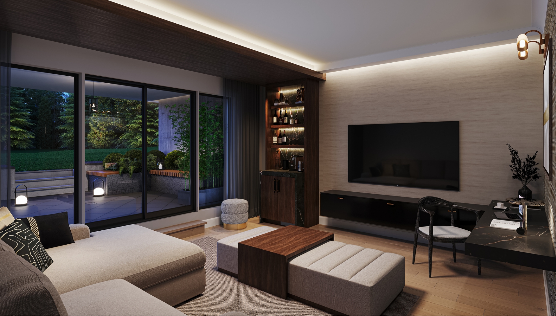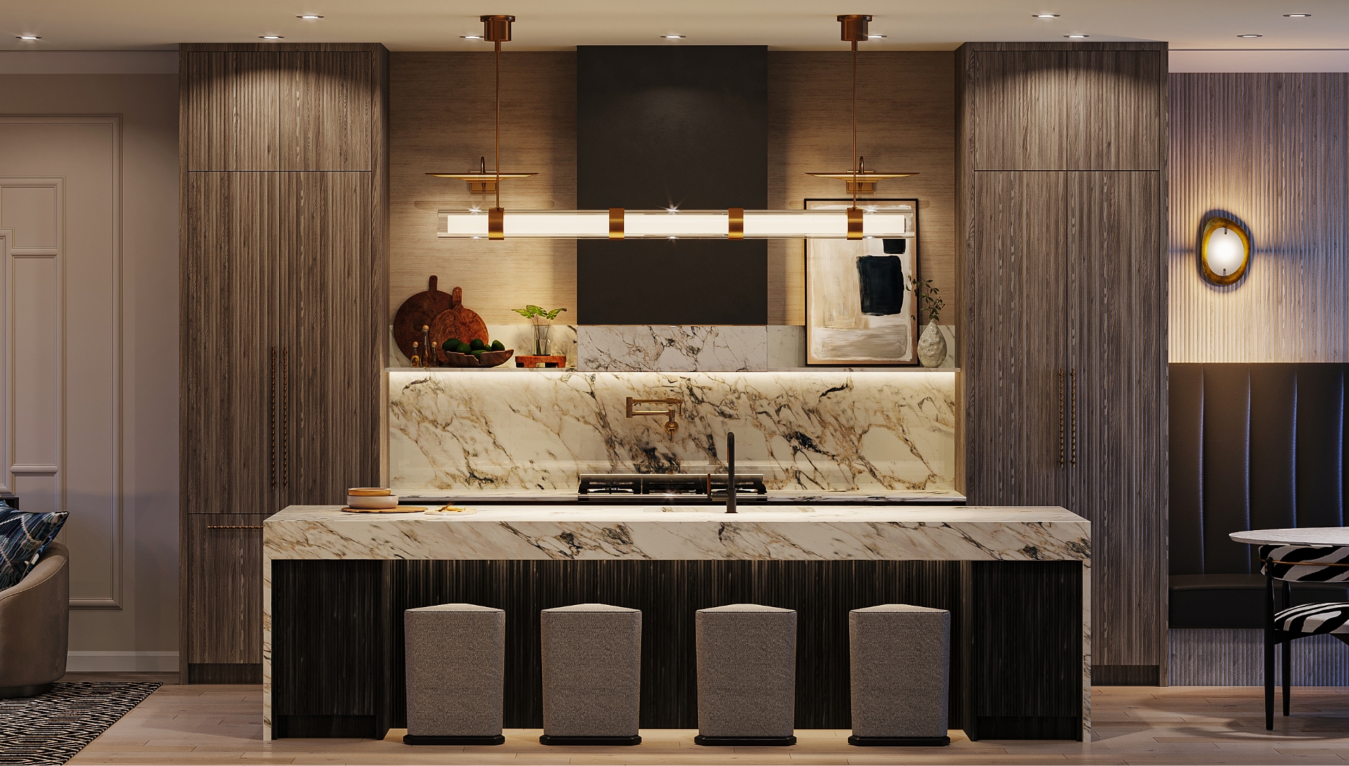 Stunning Kitchen: The elegant and modern kitchen is crafted with custom-designed cabinetry, including a spacious island, extended height upper cabinets, and under-cabinet lighting. The countertops are finished in polished granite or engineered quartz, featuring a dramatic stone waterfall on the island. A mirror backsplash enhances the kitchen's sense of spaciousness and glamour.