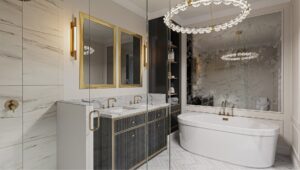 Luxurious Bathrooms: Bathrooms boast custom-crafted cabinetry, oversized vanity mirrors, polished granite or engineered quartz countertops, white undermount vanity basins, and polished chrome fixtures. Spa-like features include a frameless glass shower enclosure or a deep soaker bathtub with a chrome shower curtain rod.
